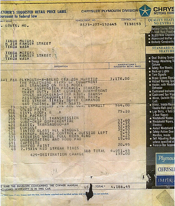 I documented all of this story and history in my files. Over the time that I was searching for the car, until getting it back in my possession here in California, it was bought, sold, and stolen more than sixteen different times! Besides myself purchasing it twice, the guy in Calgary had bought and sold it three different times. As it is today, I went to great pains and efforts to bring it back to where it was when I bought it in November of 1966. I have been told that it is the only 1967 GTX Hemi car in existence optioned as it is. This can be confirmed by checking the original window sticker. |
