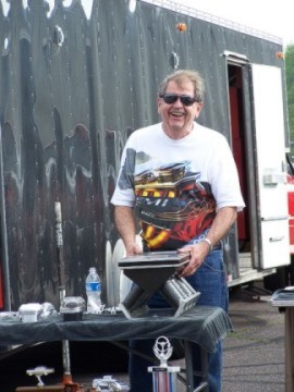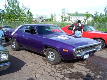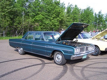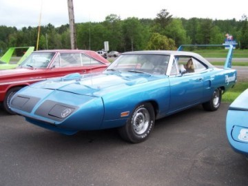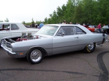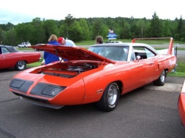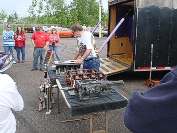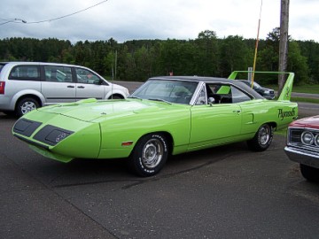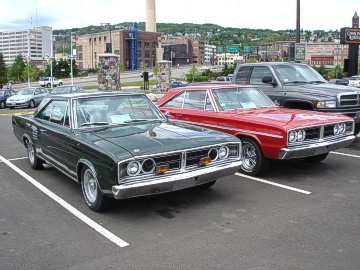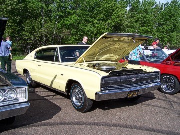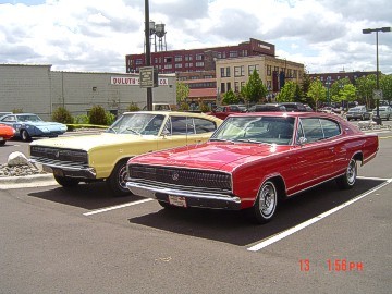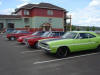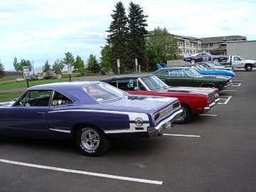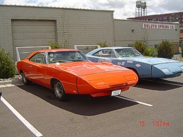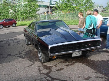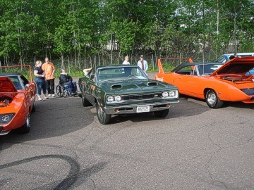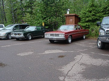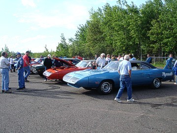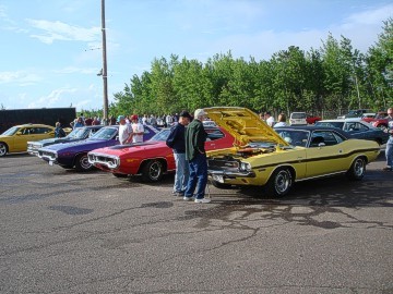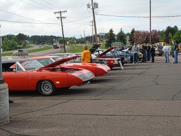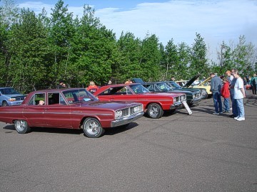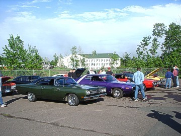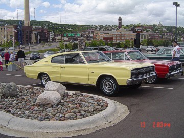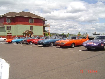 Upon arriving at Duluth Dodge, we were led to the back of the car lot where we were allowed to park our Mopars together in a long line for display. With our presence, the show 'n shine was Mopar heavy with only a few non-Mopar cars showing up. Rod Marinucci unloaded his 1968 Barracuda drag car from a nice enclosed trailer. Rod has raced this same Barracuda since 1974. He set up a table with several interesting race items, a two-piece intake manifold that he designed, rods, pushrods, a 4-speed transmission, Hemi pistons and valves. He used all of these as props for the very interesting performance seminar he presented to us. Rod also told us about his racing experiences over the years with his Mopar cars. After the seminar, a fellow Mopar lover at the show wanted to line up three generations of Chargers for a photo session, so we accommodated him with a 1966 Charger, a 1969 Charger, 1969 Daytona and a 1972 Charger. We returned to the Canal Park Lodge in early evening and sat around in the lobby and talked until the wee hours.