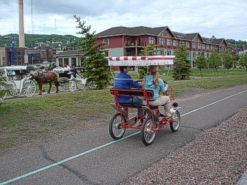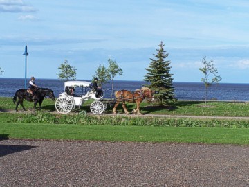 In the late afternoon, we walked around the city looking for a good place to eat. We found Hell's Kitchen just down the street from the Lodge, but decided we'd settle for something more mundane. On the way to the restaurant we spotted a weird Dodge Ramcharger sitting in the street with teeth in place of it's grille. Maybe it had been to Hell's Kitchen? In the evening, several of the members took a tour of the city via horse drawn carriage rides. Our lady horse pilot narrated all of the local hot spots and historic parts of town. It was a very relaxing and enjoyable way to see the city. There was a lot of beautiful scenery right around the Canal Park Lodge. The members enjoyed watching the different ships come into the harbor and there was even a Harbor Shipping News newspaper that had a schedule of ships and times expected so we could watch them pass under the lift bridge. Of course, there were always plenty of seagulls that pestered us.