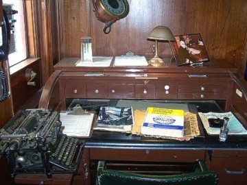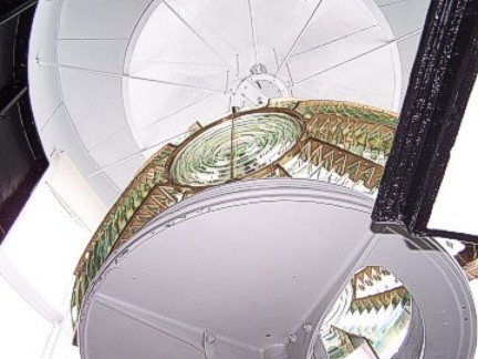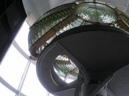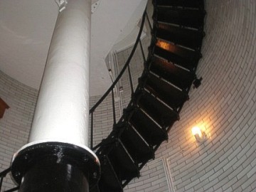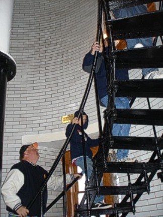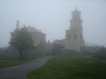 Thursday dawned very foggy, misty with a brisk cold breeze. Our group gathered in the parking lot and brought their Mopars to life for the drive north to Split Rock Lighthouse. I guess it's only appropriate that you should tour a lighthouse in the thick fog so you get the whole idea of what it's whole purpose was! After parking our cars, our group was gathered in front of the lighthouse keeper's house. The lighthouse keeper and his family lived in this brick house and it was his job to always make sure the lighthouse beam was on. When we entered the kitchen, a period-dressed woman was boiling potatoes on the old stovetop as the lighthouse keeper's wife would have in that day. We were shown each room of the house, where the lighthouse keeper would sit at his desk and type, take phone calls from incoming supply ships, where the children would play and sleep, where the adults slept. It was furnished with the original furniture, appliances and linens, and was quite comfortable and roomy. The lighthouse keeper's family led a very isolated life and they had to be quite self-sufficient because they saw no one for months at a time. Their visitors were the people who brought supplies by ship and occasionally relatives would visit during the summer months. When supplies arrived, the cargo would have to be lifted from the boat with a hoist and placed on a cart on rails and pushed and pulled up the side of the cliff, as the lighthouse sat on high bluff (rock) above the lake.