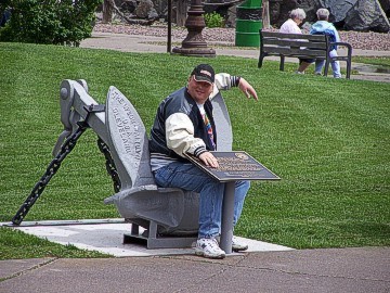 A group of members went to check out the Maritime Floating Museum which consists of the SS William A Irvin, a flagship of US Steel's Great Lakes Fleet/iron ore carrier and the Coast Guard Cutter Sundew. Part of the Maritime Museum also included a building full of history of ships in the Duluth Harbor and Great Lakes, parts of ships, small and large models of ships that had sailed the Great Lakes. We watched a video about ore and coal ships in the early years and there was a full-size mockup of the captain's helm complete with controls. From here you looked out the windows at the lake making it seem like you were really piloting the ship. The Coast Guard Cutter's main job was to break up the ice in the harbor so incoming ships could navigate the waters. We came out of the museum to find Stuart Sutton waiting for us, perched comfortably on an anchor in the yard.