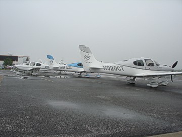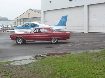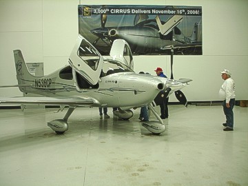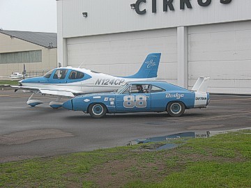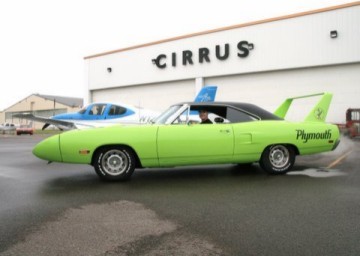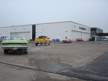 At 9:00 am on Tuesday, the distinctive rumble of Mopar big blocks could be heard and the 2008 meet officially kicked off with meet coordinator Gary Homstad leading us to Cirrus Aircraft Design. After parking our cars in a group outside the building, we were graciously welcomed into the reception area of Cirrus to meet our tour guide. Cameras were not allowed inside the plant hence we have no photos of the assembly line to share. However, after our lengthy tour, each of our cars were staged with a Cirrus plane outside the plant and the cameras clicked like crazy! Cirrus is the only manufacturer of Part 23 certified aircraft in the world with a rocket-deployed 55' parachute as a standard feature. The planes are made of carbon fiber, fiberglass and aluminum. The day we toured Cirrus they were building four-passenger 550 c.i. twin turbo planes with 330 hp @ 2,700 rpm. They carry 92 useable gallons of 100 octane aviation fuel and cost $548,000 fully equipped. The planes are put through a 20-minute test run and then four hours of flying time is put on each before it is certified by the FAA. The parachute, which can be deployed by the pilot or the passengers with an overhead handle, is a one-time use only. Just like our cars, you can get some options such as A/C and turbos on their planes. The assembly line tour was very detailed and extremely interesting. The serial number is placed on the fuselage when it begins its journey through assembly. A matching number set of wings is built elsewhere on the assembly line and catches up to the fuselage later. Four planes are built each day. They spend about 2-1/2 hours at each assembly line station. Cirrus has built over 4,000 planes to date. The service life of the planes is 12,000 hours. Cirrus aircraft can be purchased in blue, silver, white, red and gold. Any other special colors cost extra. Although we didn't get to see any, Cirrus was just gearing up to build a jet aircraft.