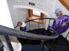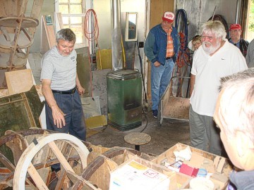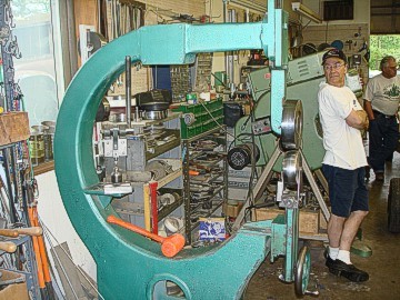 Cass is a very humorous man and showed us his "Polish Switch", a wooden pedal on a rope that he made that was attached to a seam rolling machine. Using the pedal he could stand at any position while using the machine. Since Cass is a one-man-operation and works alone, he has invented ways to work with the metal and wood by himself. The Polish Switch enables him to use both hands on the machine while turning it on and off with his foot.