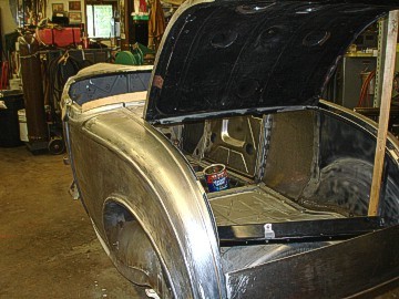 One of the projects he showed us was a 1932 Ford Roadster. He had many of the metal panels already installed and try as we might, we were unable to see any welds on the inside or outside of the panel, even in bare metal! Cass is very meticulous about his work and it's amazing to see the quality of the parts he builds. Before he ships the bodies out, he coats them with oil or cheap clear paint that will come off easily with paint thinner. Two of the car bodies we saw will be shipped ready to bolt onto the stock chassis when they arrive in Russia. It's amazing that Cass can build these bodies as he had never seen the chassis; all he has to work from are the measurements, drawings and pictures.