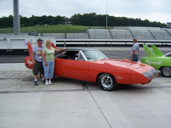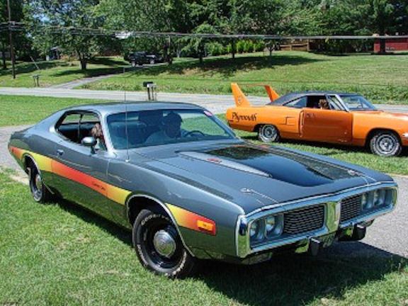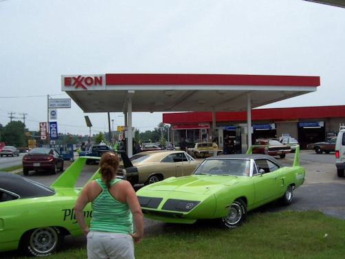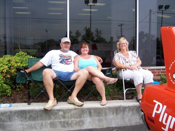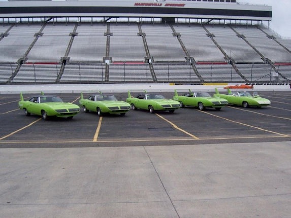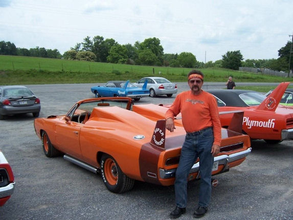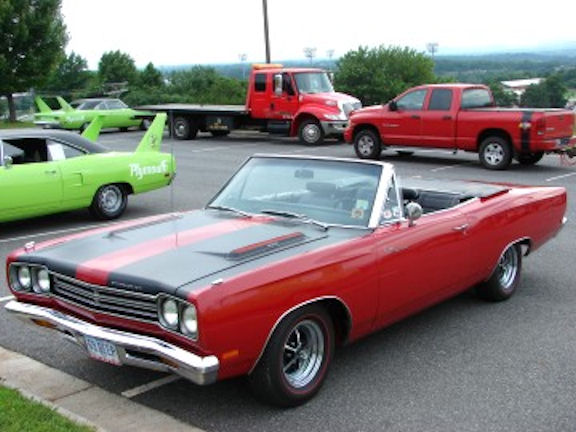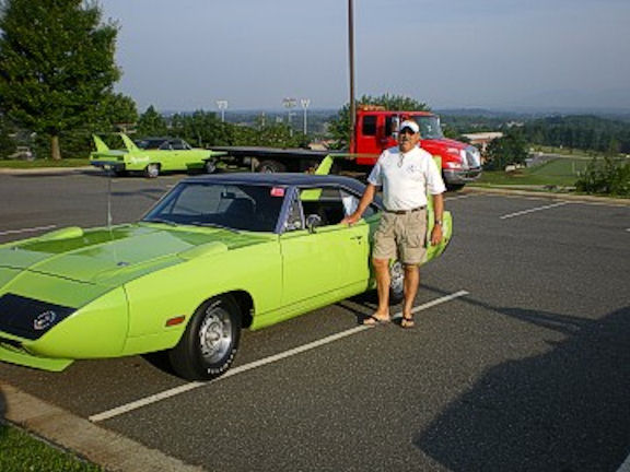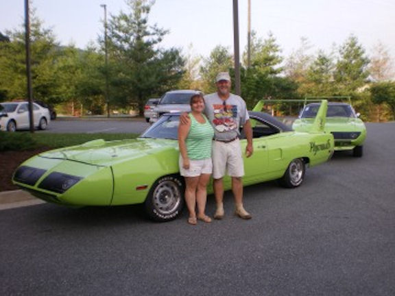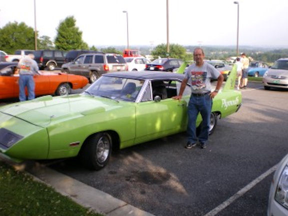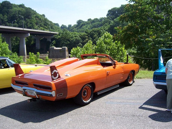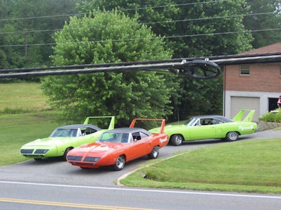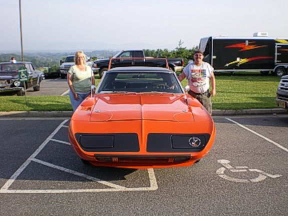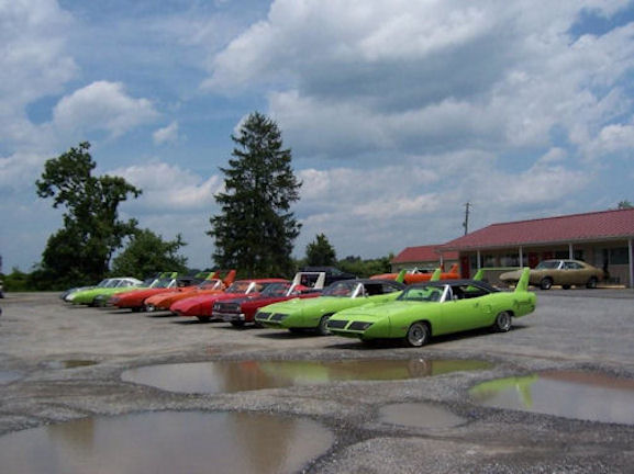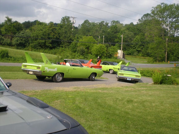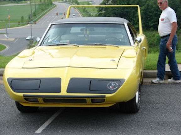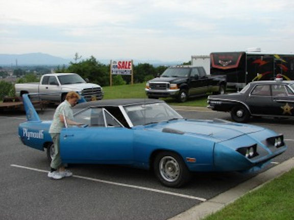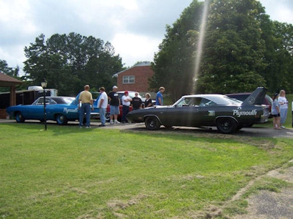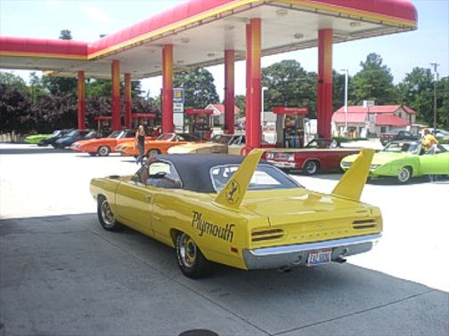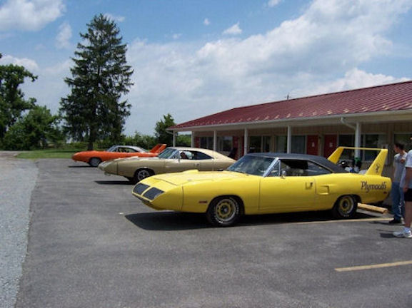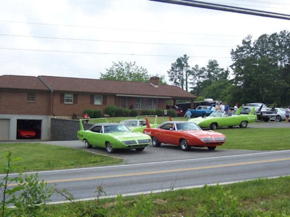 The remaining cars then cruised to Rita and Barry's for a farewell cookout, during which Rick Edwards and Stan McGuire did minor repairs to their cars. Stan--"It ain't a road trip if you don't have to fix one". There was nearly a constant train of cars pulling up to look at the cars and take pictures. the group then cruised to a local cruise-in at Liberty University, which takes place every third Saturday, April through October. Having seven wing cars, a '74 Charger Rallye and Stan's Runner convertible created quite a stir, as we had our own area roped off. We inadvertently hurt the feelings of the local Thunderbird club, as they were three rows down from us. Nearly every time you looked at the late '50s T-birds, the owners were all standing at the back of their cars looking like a bunch of Maytag repairmen as they watched everyone coming up to look at the wing cars. Thus ended this year's meet.