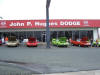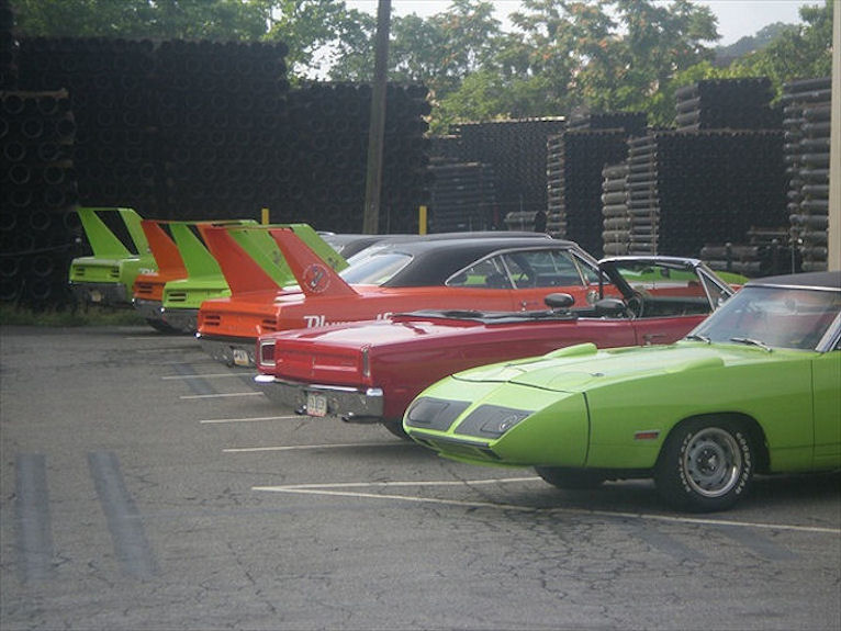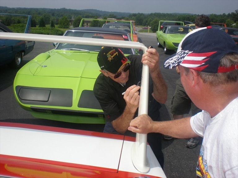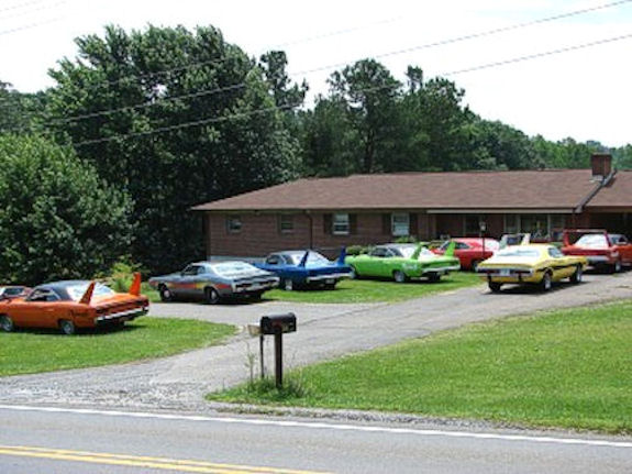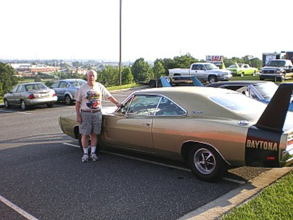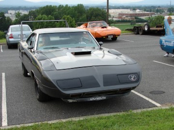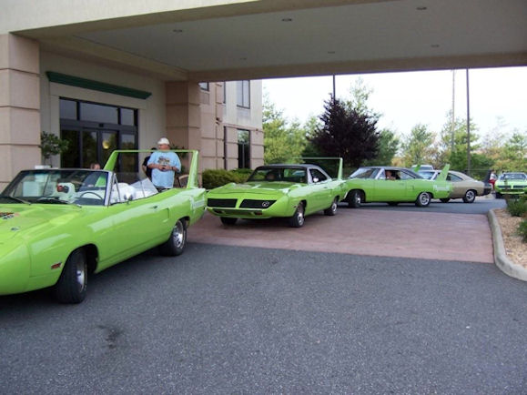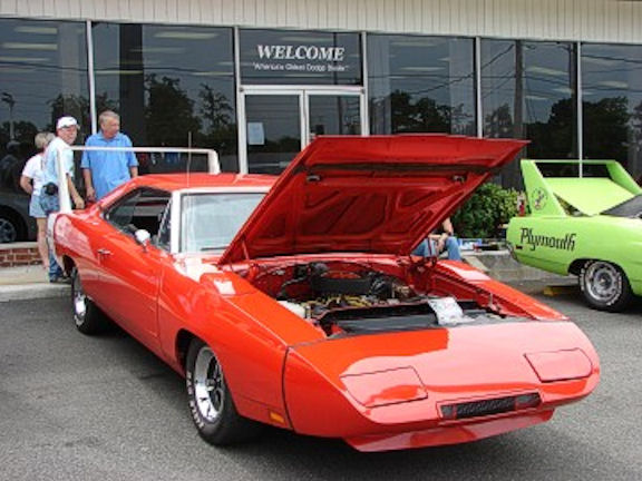 Sunday morning was slightly overcast but a great day for being out with the cars. Ten winged cars journeyed out to John P Hughes Motor Company, formerly the oldest continually operating Dodge dealer (they got caught up in the cuts). A good time was had by all, comparing notes, pictures of their cars, and looking over everybody's rides, as passersby were dazzled by the sight of that many wing cars lined up in front of the building. Owner Holcomb Hughes joked that the line-up of wing cars was probably worth more than the inventory on his lot. We were also joined by Rusty Nix (Aero Warriors) and his '69 Torino Talladega from Roanoke. When asked why he was allowed, I responded that they looked at the back of winged car quite a bit before, I figured he could look at the back of one for one more time.