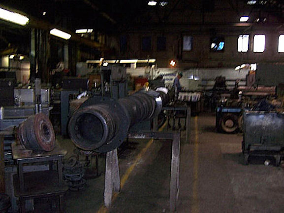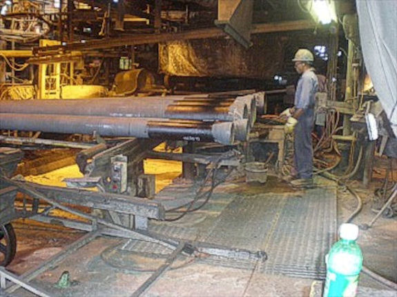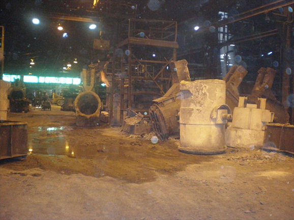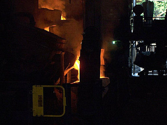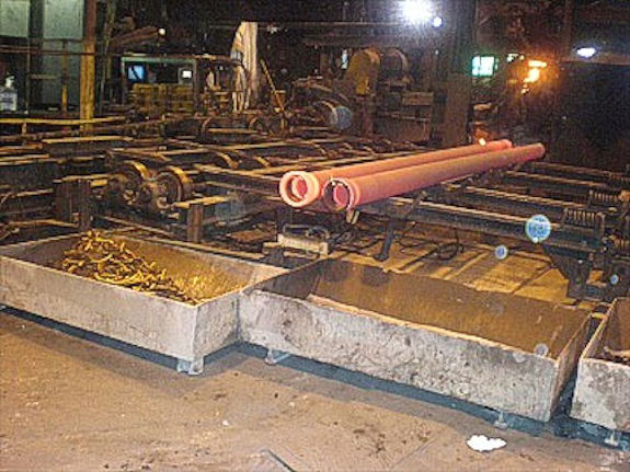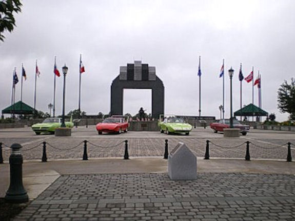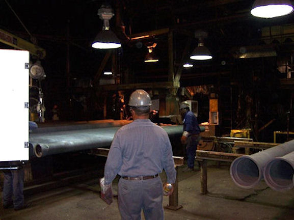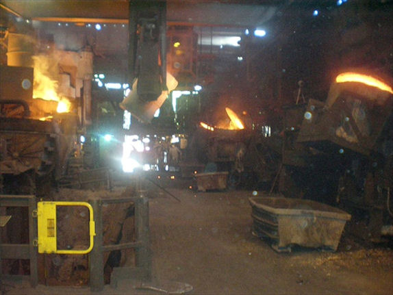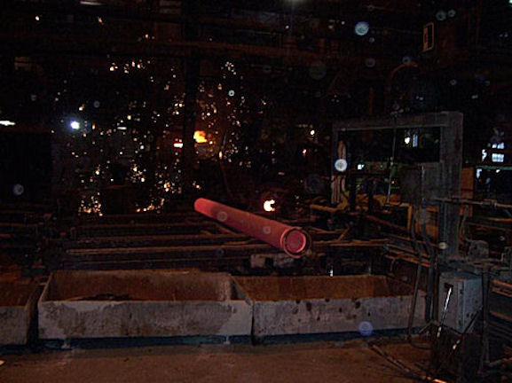 Thursday showed up overcast, but soon cleared and became very humid. Recent arrivals swelled the ranks to twelve winged cars and Stan McGuire's RoadRunner convertible. The day began with a tour of Griffin Pipe Foundry, which produces centrifugally cast ductile iron pipe for municipal water systems. We were able to see pipe cast, finished and loaded for shipment. The chief raw material for Griffin is shredded cars, and with production of 500-600 tons of iron daily, a LOT of old Pintos and Vegas have been sacrificed.