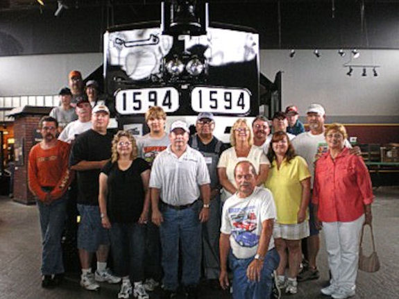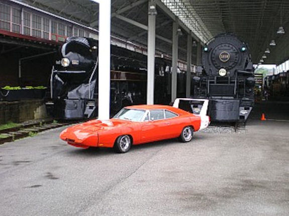 Wednesday morning dawned dreary and raining. Again several members took their tow vehicles, but a few of the more intrepid adventurers took their cars out for this trip. The first stop was the Virginia Museum of Transportation in Roanoke, VA. The museum has an auto display gallery (no Plymouths or Dodges, but a DeSoto), and a significant collection of railroad steam locomotives and rolling stock, appropriate since Roanoke was the home base of the Norfolk & Western Railroad. Randy Morrison did a great job of incorporating this theme into the event T-shirts as the front scene features a Superbird, Charger 500 and a Daytona and the #611 locomotive. This also proved prophetic, as with the small group of cars on hand (Rick Edwards' Superbird, Stan McGuire's '69 RoadRunner convertible, Stuart Sutton's Birdable and Barry Moorefield's Daytona) we got permission to take the cars into the display area and park them with the #611 and #1218 locomotives for a photo op.