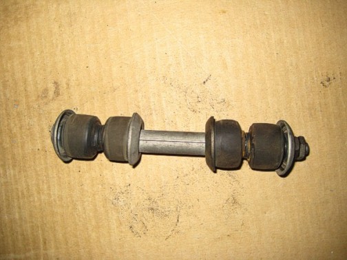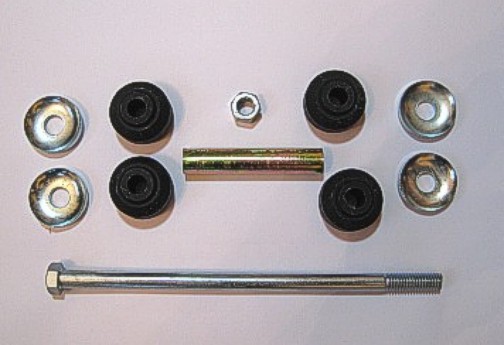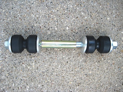 To begin assembly of the link, place one of the retainer washers--cup side up--and slide it to the end of the bolt. Place a bushing with the rounded side toward the retainer washer and slide it on. Start this assembly through the sway bar. Install a bushing with the cone end slid down against the sway bar. Put another retainer washer on with the cupped side down against the bushing. Slide on the metal sleeve. Next slide on another retainer washer with the cupped side up, then a bushing with the rounded side against the washer. Put a bushing with the cone side down against the last bushing and a retainer washer with the cupped side down. Start the nut on finger-tight. Repeat this same assembly at the other end of the sway bar.