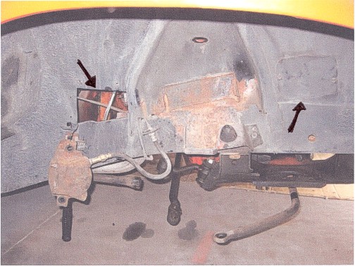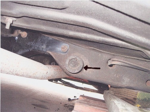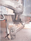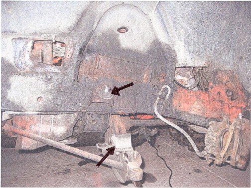 Remove the front sway bar using 1/2" and 9/16" wrenches or sockets. Take the link bolt and the hardware out of the sway bar and the lower control arms on each side of the car. Then remove the retainer brackets from the front cross-member. Turn the sway bar towards the front of the car and slide it out through the opening in the front cross-member. The arrow at the right of the first photo below shows the sway bar retainer bracket and the arrow at the left shows the sway bar link bolt. The second photo shows the link bolt assembly and the third photo shows the sway bar retainer bracket.