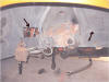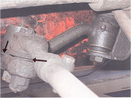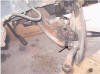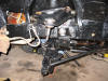 Remove the torsion bar lock ring from the frame. They are located on both sides of the rear side of the transmission cross-member. Grab the top of this wire ring with pliers and pull it down and back toward you. Photos below: The arrow points to the end of the torsion bar in the frame as seen from the rear side of the transmission cross-member. This is officially called the "torsion bar rear anchor". This is what the lock ring looks like after it is removed from the torsion bar end.