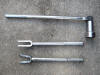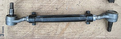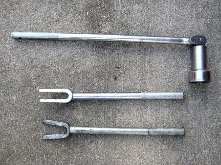 Remove the cotter keys and nuts on the idler arm-to-center link and both tie rods. Use the pickle fork to separate the idler arm and the other tie rod from the center link and lower ball joint. The photos below are from left to right: These are tools you will need, a ball joint socket and pickle forks of various sizes; the arrow points to where you separate the inner tie rod end and the idler arm from the center link; the third photo shows where the separation is to remove the outer tie rod end; the last photo shows the tie rod assembly removed.