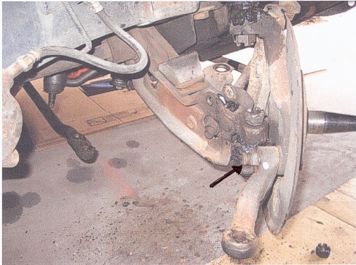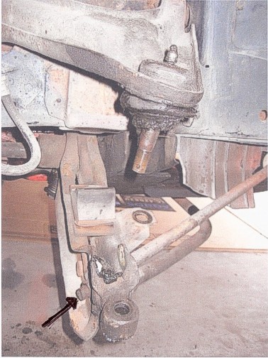 Remove two bolts that hold the lower ball joint to the spindle with a 15/16" socket. Take the cotter key and nut off the lower ball joint knuckle with a 7/8" socket. Take the cotter key and nut off the upper ball joint knuckle with the same socket. Use a small pickle fork to separate the lower ball joint from the lower control arm. Use the larger pickle fork to separate the upper ball joint from the spindle. Remove the lower ball joint and spindle. The photo below shows the back side of the brake dust shield with the lower ball joint still attached to the lower control arm. The arrow points to the bolts that holds the lower ball joint to the brake dust shield and the back of the spindle.