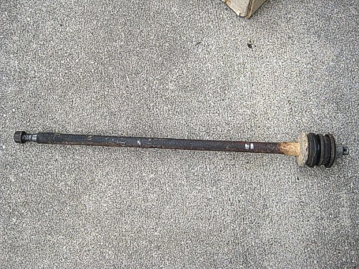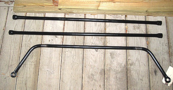 Remove the torsion bar. The bars are marked left and right (L and R) and they must be reinstalled on their correct side. The photo below shows the front sway bar and the torsion bars, cleaned up and I painted mine black, but to be correct they should be bare metal.
