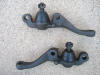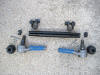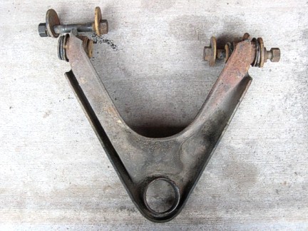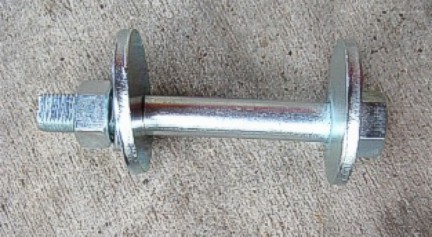 Remove the front and rear cam bolts that hold the upper control arm. They are accessed from the holes that you previously removed the rubber covers from. Remove the upper control arm. Clean all of the lower and upper control arm assemblies very well before taking them to the machine shop. "Cleanliness" is the key word when working with the polygraphite parts. Everything needs to be very clean when you get ready to reassemble it. The photo below shows the upper control arm and the cam bolts after removal from car.
