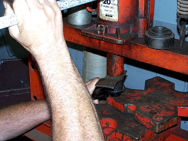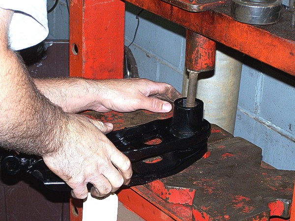 After installing the bushing insert, the machinist will press the shaft back into the lower control arm bushing. The lower control arm is now rebuilt.