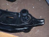 Install your front sway bar by holding it with both ends pointing toward the front of the car. Slide the bar through the hole in the front cross-member (doesn't matter which side you put it in through) and flip it over so the connecting holes are back near the lower control arms. Locate your old sway bar bracket (shown below left) and lube the inner hole in the new bushings with the lube supplied in your PST kit (shown below right).