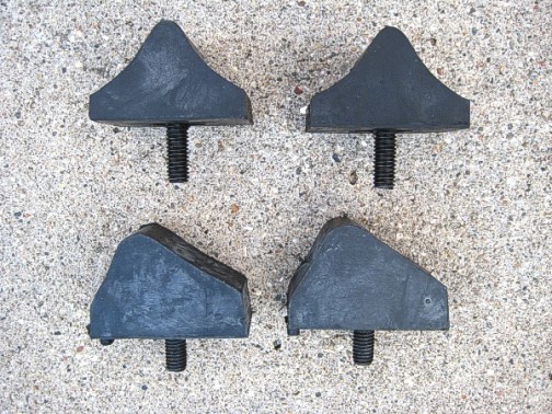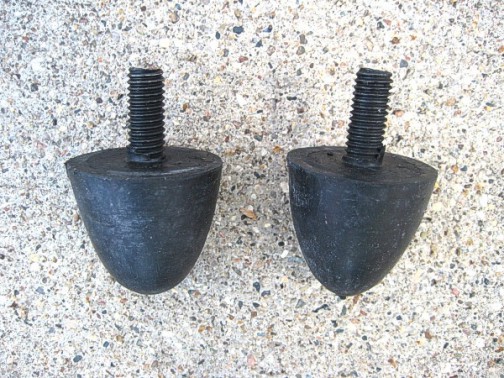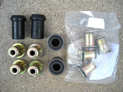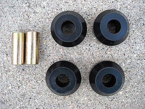 **Before you ever start the rebuild, inspect your new parts to make sure you have everything and it's correct. The PST kit we received had the wrong lower control arm bumpers in it. These are the bottom two shown in the photo below. The correct bumpers that you should use are shown at the top of the photo. With a quick phone call, PST was happy to send the correct ones and even over-nighted them to us! It was a pleasure to deal with this company, as they went out of their way to help us. Not knowing for sure just what we should have in our kit to begin with, the PST technician went through everything we received and told us what it was and how many there should be in the box.