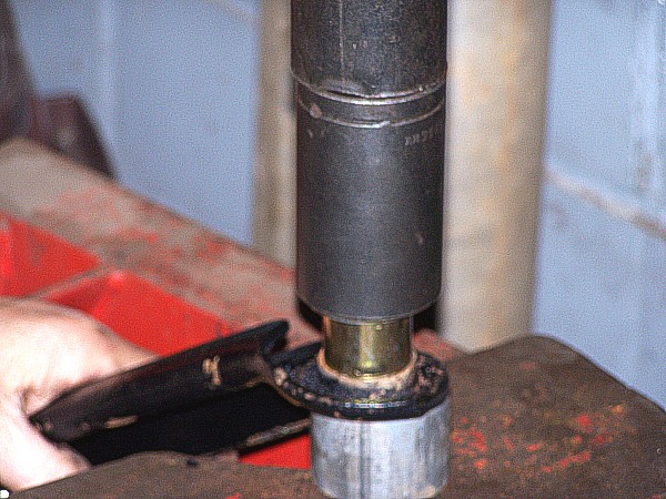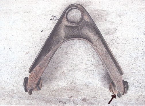 Next the machinist needs to press the old bushings out of the upper control arm from the inside-out (shown in first photo below). The machinist needs to be very careful with the bushing support sleeve as it is easily damaged. He will then press the new bushings into the upper control arm with the tapered part of the bushing seats on the arm. The bushing support sleeve will be pressed onto the rear bushing only. Perform the same procedure for the other control arm. You are now finished at the machine shop. Note: The sleeve (arrow in the photo at right below) is used on models with 10" brakes and on police and taxi applications, which includes Superbirds.