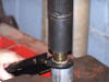Remove the upper ball joint using a 1-7/8" ball joint socket (Snap-On part #S9365B). The upper ball joints unscrew; they are not pressed in! (Ben has sold many upper control arms because people have damaged them trying to press out the ball joint). This will be extremely tight and you may need to use a pipe for extra leverage. The photo below shows the upper ball joint still in the upper control arm on the car. If you do not have a large vise, you will want to remove the ball joint while the upper control arm is still on the car.