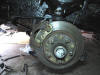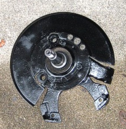 Remove the brake caliper and tie it up out of the way. Remove the shock absorber. Remove the wheel bearing and the rotor.