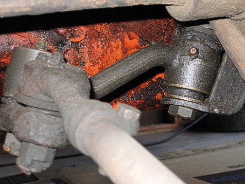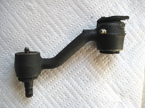 Install the new idler arm from your PST kit. Our old one is shown on the left below. Install the bolt with the nut on the bottom. Tighten the nut to 65 foot-pounds and install the cotter pin. Place the idler arm stud through the center link and tighten the nut to 40 foot-pounds. Install the cotter pin. At right below is the new idler arm installed on the car.