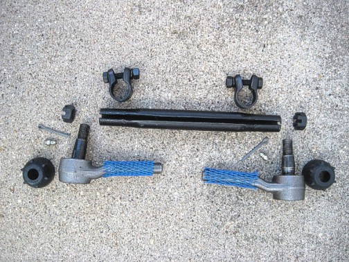 Now you're ready to assembly your new tie rod and ends. The parts in your PST kit are shown below. Remove the plastic thread protectors from the tie rod ends. Lube the threads on each tie rod end with anti-seize compound. Slide the clamps over the tie rod ends, one at each end, making sure the clamp bolts are facing the same direction. Then screw the tie rod end in approximately 4 to 5 turns. (One tie rod end is left-handed threads, the other is right-handed threads. They screw in real easy, so make sure you have the correct one on each end so as not to damage the threads). Now refer to your old tie rod ends for the total length measurement. Holding the tie rod ends, have someone turn the tie rod (in the center) to adjust the length so it is the same length as the old one.