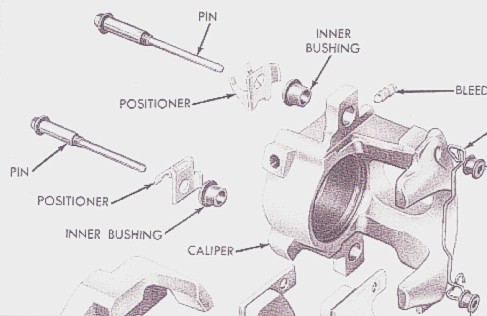 Inspect the front brake pads and replace if necessary. Position the brake caliper over the rotor and align the holes for the pins. Place the positioner clips (commonly referred to as anti-rattle clips) over the pins --see reference diagram below. Apply silicone lubricant to the pins and any surface that the caliper slides on--DON'T get any on the rotor or brake pads!! Install the pins with the positioners open end towards the outside and the arrows pointing upward. Be very careful when starting these pins, as it is very easy to cross-thread them. Tighten the pins to 35 foot-pounds.