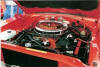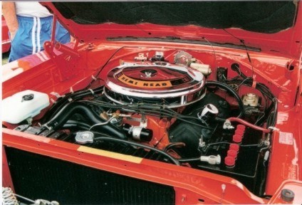 The car is not an original V2 car, as it is coded to be F8 green. The gentleman that I purchased the car from had repainted the exterior in V2 Hemi Orange in the early 1990's. Somewhere during its previous history, it was also painted R4 red, and when I bought it the engine compartment was still wearing the R4 with the V2 exterior. Not too much has been done to the body itself since that repaint, although I have had most of the chrome and trim parts refurbished. The engine compartment was painted to match the exterior while the engine swap was underway. Since the car would have had 15" wheels, I secured a set of "H" wheels and redline bias-ply tires to complete the sleeper/taxicab look. Within the last couple of years the seat covers have been replaced, and the trunk was just detailed out last summer.