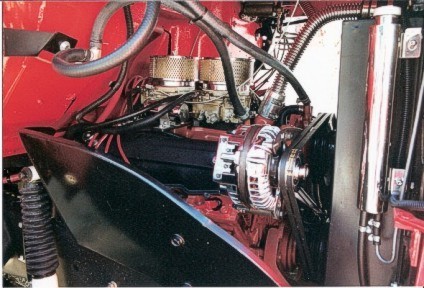 Norm rebuilt the original Polysphere engine with a Mopar Performance 4" Stroker crank, and we made other modifications to work with this heavy vehicle type of application. One of the most unexpected modifications is the late 1950's ('58?) dual-quad manifold that would have originally been installed on a Sport Fury. The pair of 390 cfm carburetors looks a little unusual in this truck, but the combination actually performs quite well. On my 2005 trip to the Mopar Nats, I got 7.5 mpg over the 1,000-mile round-trip while hauling the R/T. I had expected much worse, to be honest. While at cruising speed in high gear, it is turning approximately 3,500 rpm at 70 mph.