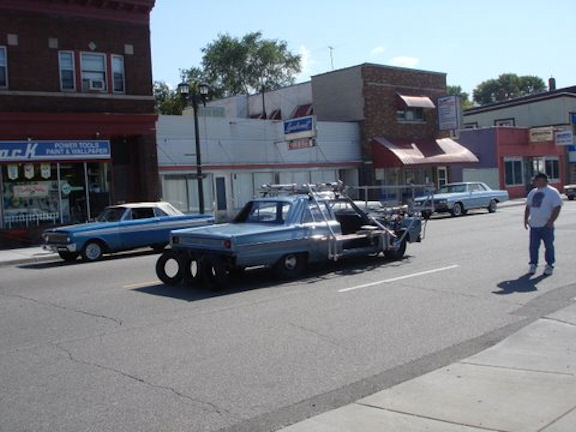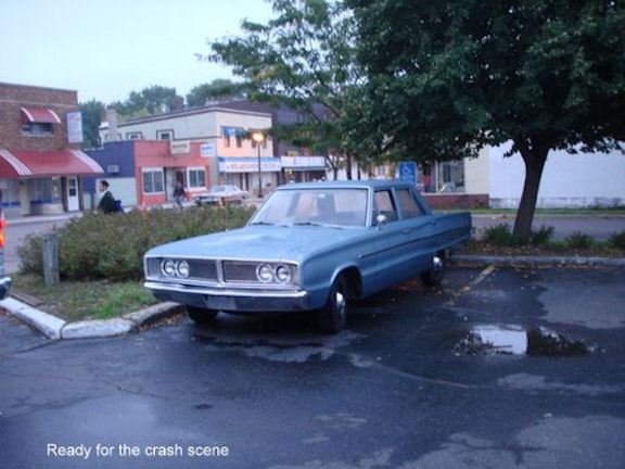 Fast forward to late summer, and Janet is checking our emails and tells me there is a note from a friend stating that the Coen brothers are looking for a 1966 Coronet four-door for their new movie "A Serious Man". I called the number and talked with Mike. He tells me they need three 1966 Coronet four-doors for the movie and as of then, they only had one. I told him we had one and he wanted to see pictures. We emailed him pictures and the next thing we know, they want to buy the car. I told him we had not planned on selling the car and he said he would rent it but they were going to paint it blue and it would also be in an accident, being hit from behind at about 10 mph. With that, I stated that when we bought the car we had planned on selling it, but our family had gotten attached to the car. I told him that if we were to sell the car we would ask $$$$ and his response was, "No problem. When can we pick it up?" Now the price I quoted him was what I consider fair market value. My reply was that I'd have to check with the rest of my family and after much discussion, we decided to sell. We emptied the car of all of our personal things and they wanted the stock wheels and hubcaps so we installed them (as shown below).