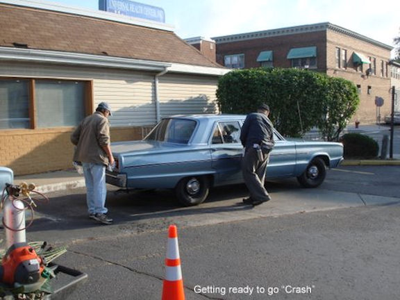 Meanwhile, I was out back (inside the building) where we parked our car next to the other '66. Mike and Mark walked around the two cars noting the differences. The first thing they noticed was that our '66 sat higher in the rear. I told them that was due to the air shocks. They wanted me to lower the car so I let out some air, dropping the car a couple inches and they were happy. The other differences were: our '66 is a 440 model and the other was a Deluxe, so the side chrome was different as well as the horn ring. Also, our car had a radio and the other car was a radio delete. All in all, they were happy with the car and the two cars will look the same by the time they are used in the movie.