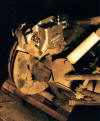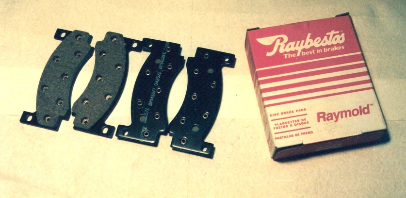 From left to right: Photo #4 New Raybestos brake pads--modern bonded material with wear indicators that will cause a squeaking noise to alert you that the pads are about gone. No rivets in these pads to grind the rotor face. Retail price approximately $20 at NAPA. Photo #5 Our rotor was heavily rusted with some pitting, and ridges made from worn original brake pads. Photo #6 The same rotor after it was refaced at the machine shop. This rotor is at its minimum thickness of .0980" now.