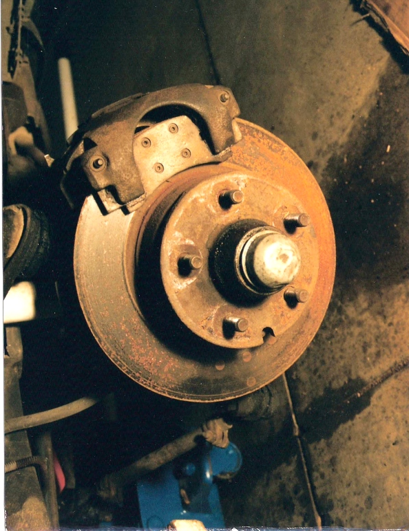 refaced rotor with a new caliper assembly and new brake pads installed. Photo