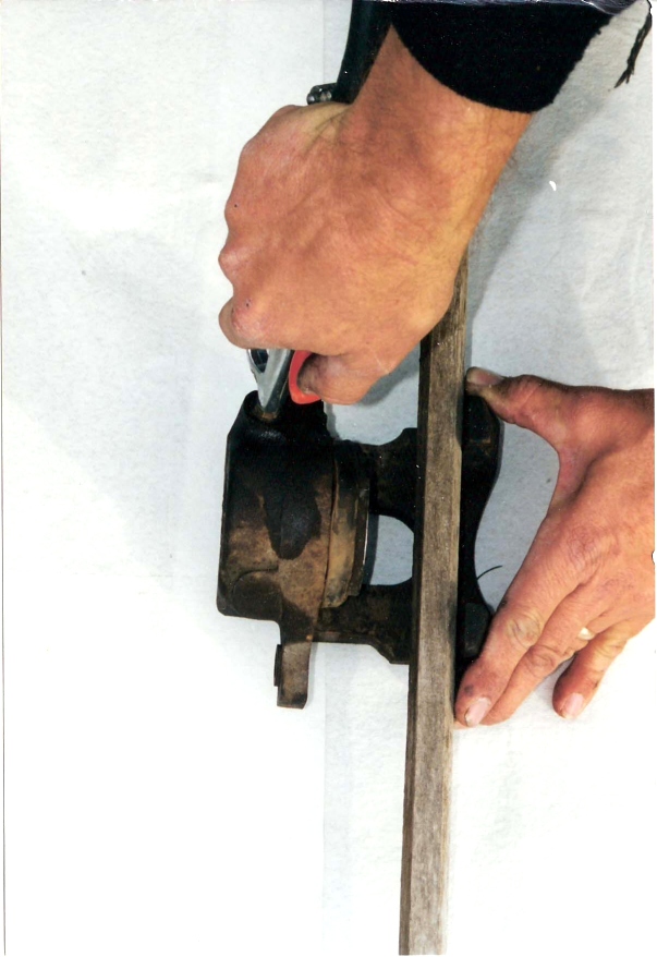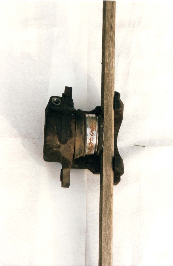 Now to begin disassembly of the caliper, lay the caliper on a solid surface and slide a board down into the caliper assembly as shown in Photo #7 below. The board will protect the piston from damage by keeping it from slamming against the caliper housing. Place an air compressor hose fitting on the brake hose fitting and blow the piston out of its bore. Don't overdo it here--only a quick burst of air pressure is needed and NOT have your fingers anywhere near the bore!